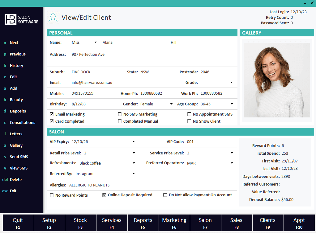 The client dashboard is a powerhouse of information, displaying key metrics such as Number of Visits, Average Days Between Visits, Reward Points, Total Amount Spent, First and Last Visits, Deposit Balance, and the Number and Value of Referred Clients